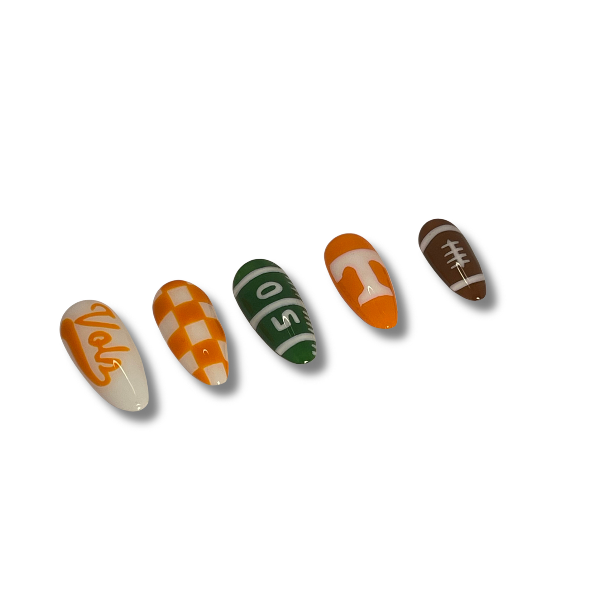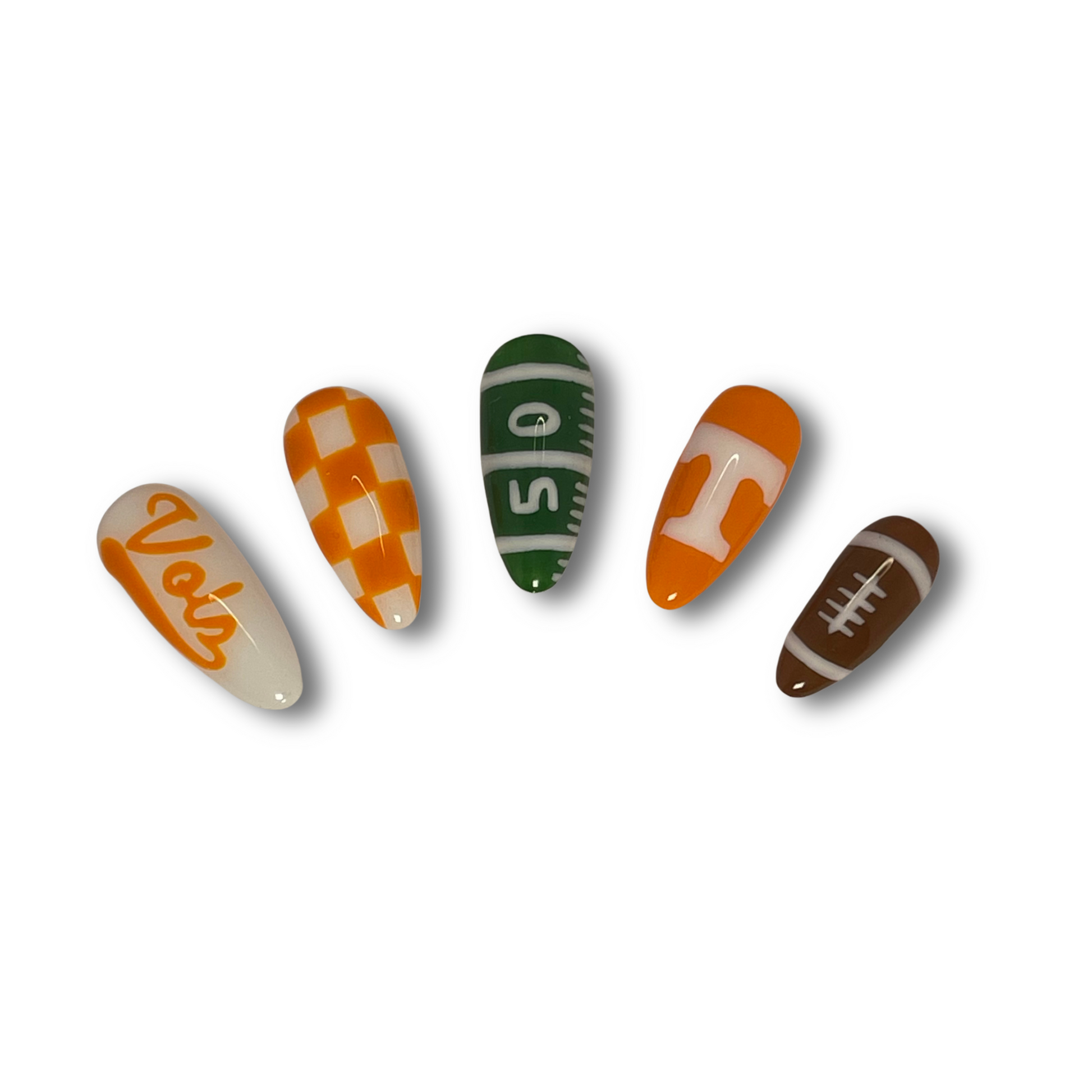 Show your Volunteer pride in style! These press-on nails are inspired by the University of Tennessee, featuring bold orange and white designs perfect for game days, tailgates, or everyday spirit wear.