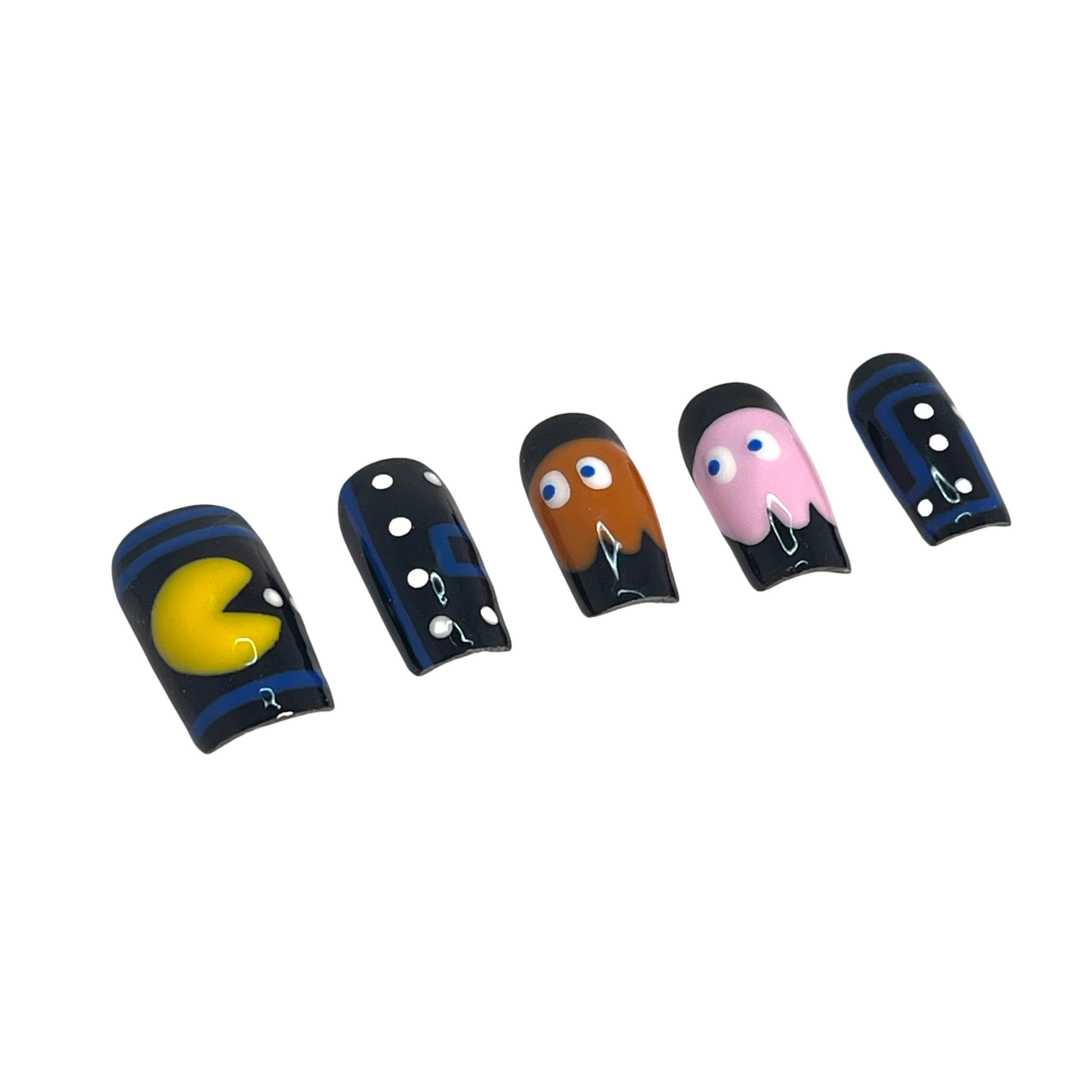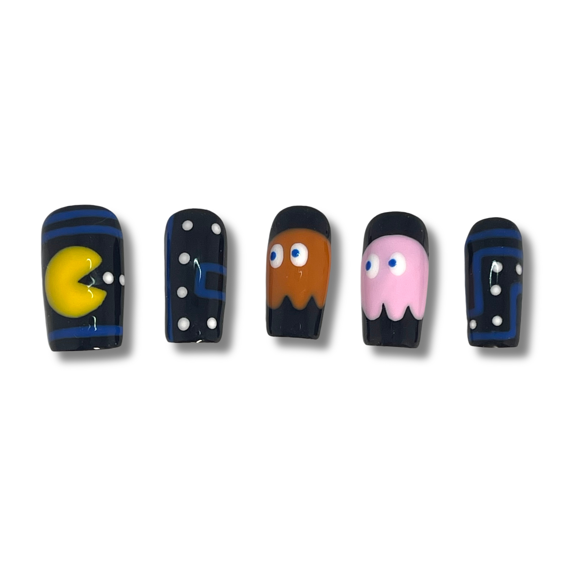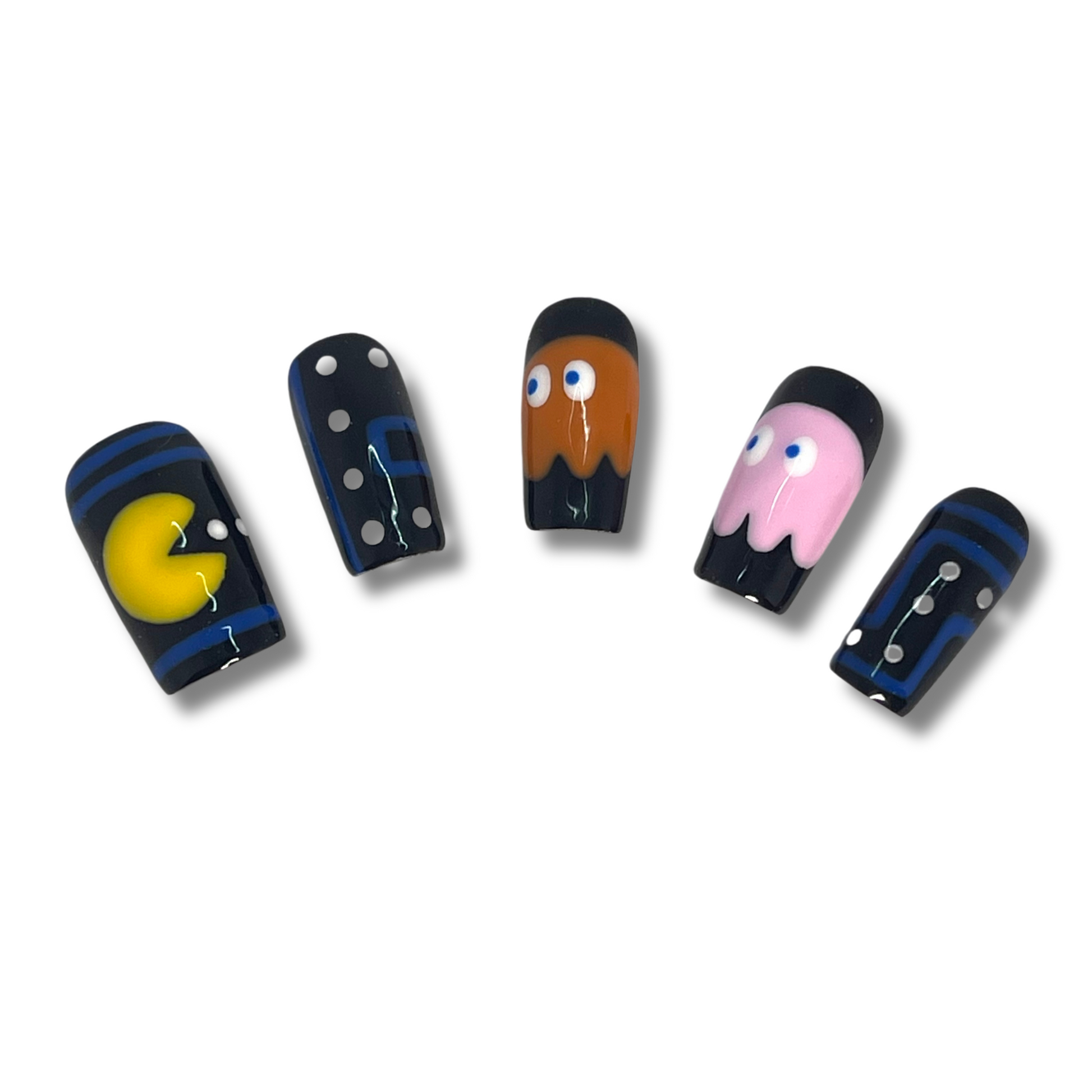 Level up your mani with this arcade-inspired set! Featuring playful Pac-Man vibes and bold retro colors, these nails are perfect for anyone who loves a little nostalgia with their style. A fun mix of quirky charm and vintage gamer flair that will have you ready to press play on every outfit.