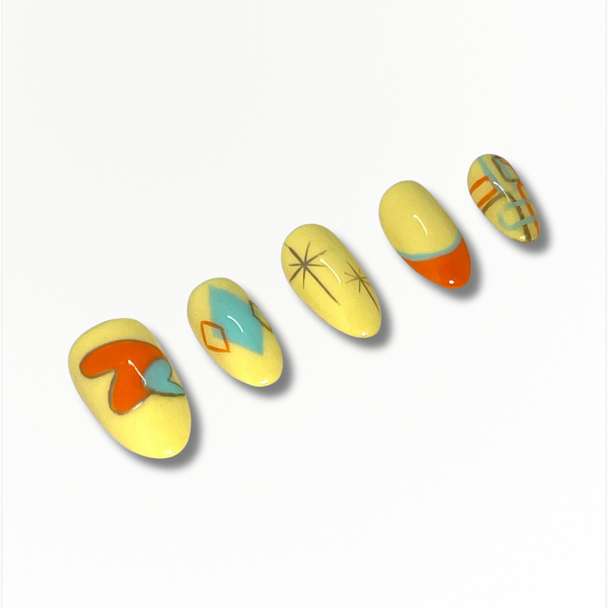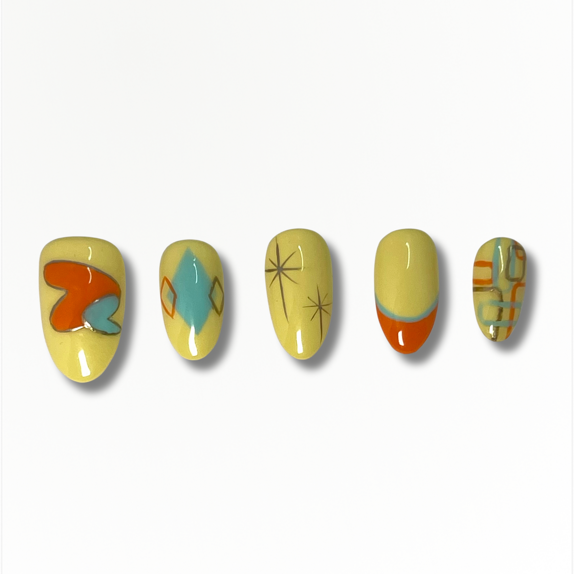 Inspired by the bold shapes, clean lines, and iconic color palettes of mid-century modern art, this press-on nail set is a wearable masterpiece. Think atomic-era angles, color blocking, and that perfect balance of retro minimalism and playful flair.
